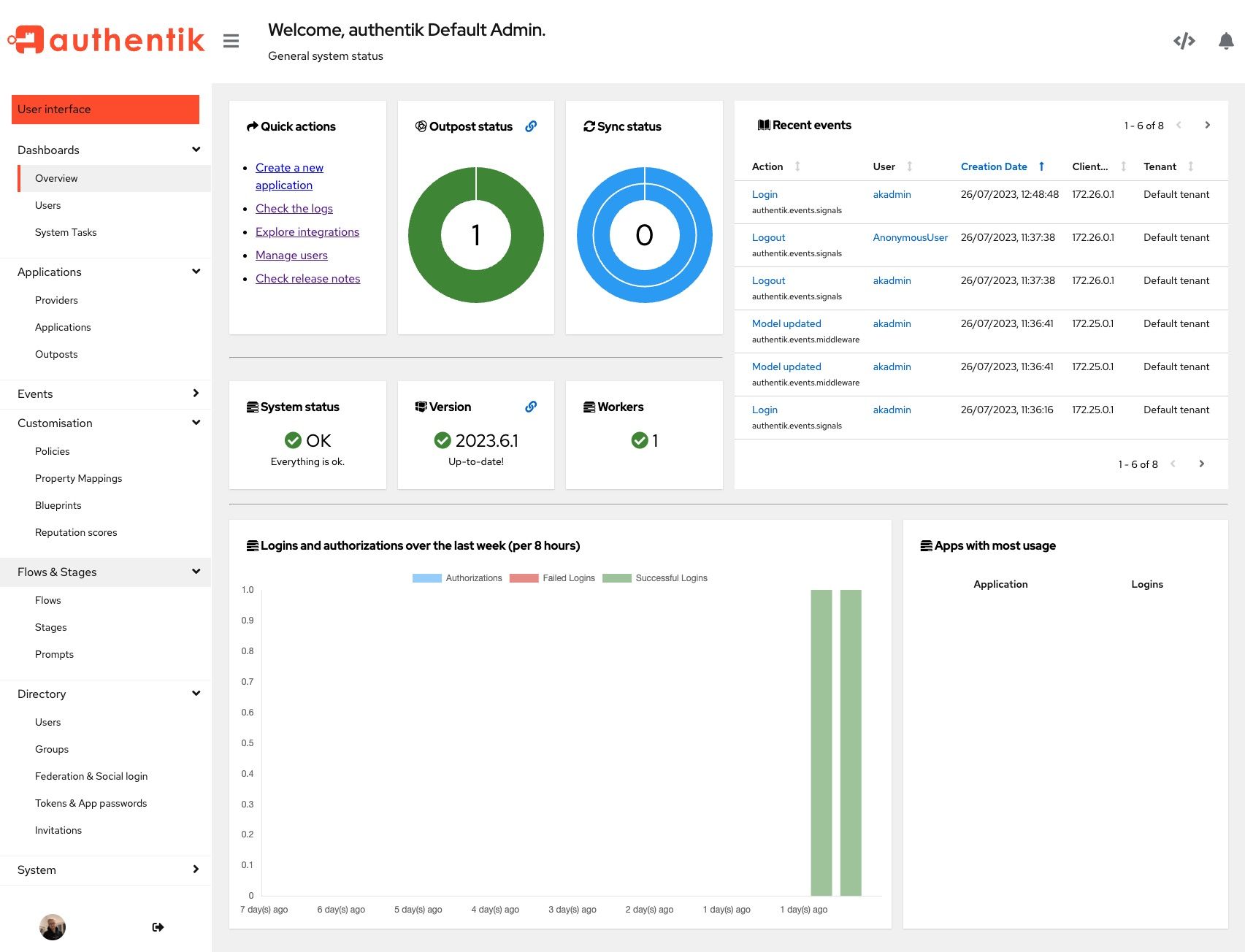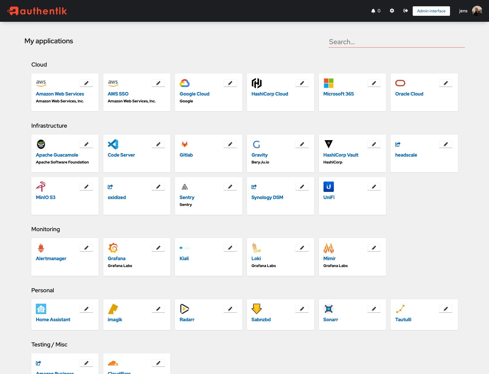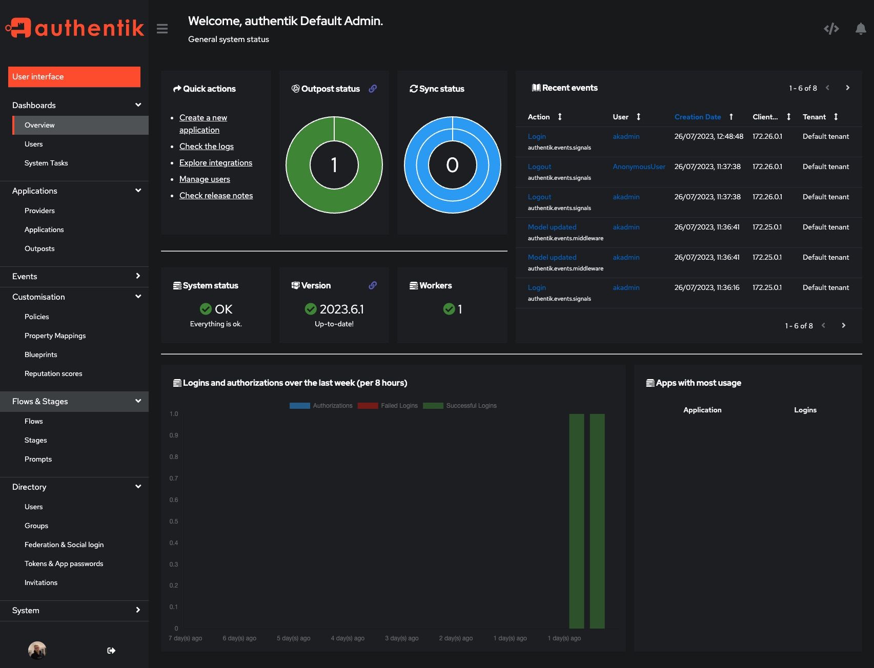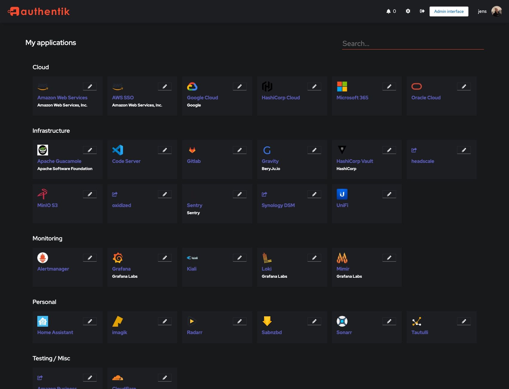 User interface: this console view in authentik displays all of the applications and integrations in which you have implemented authentik. Click on the app that you want to access to open it, or drill down to edit its configuration in the admin interface