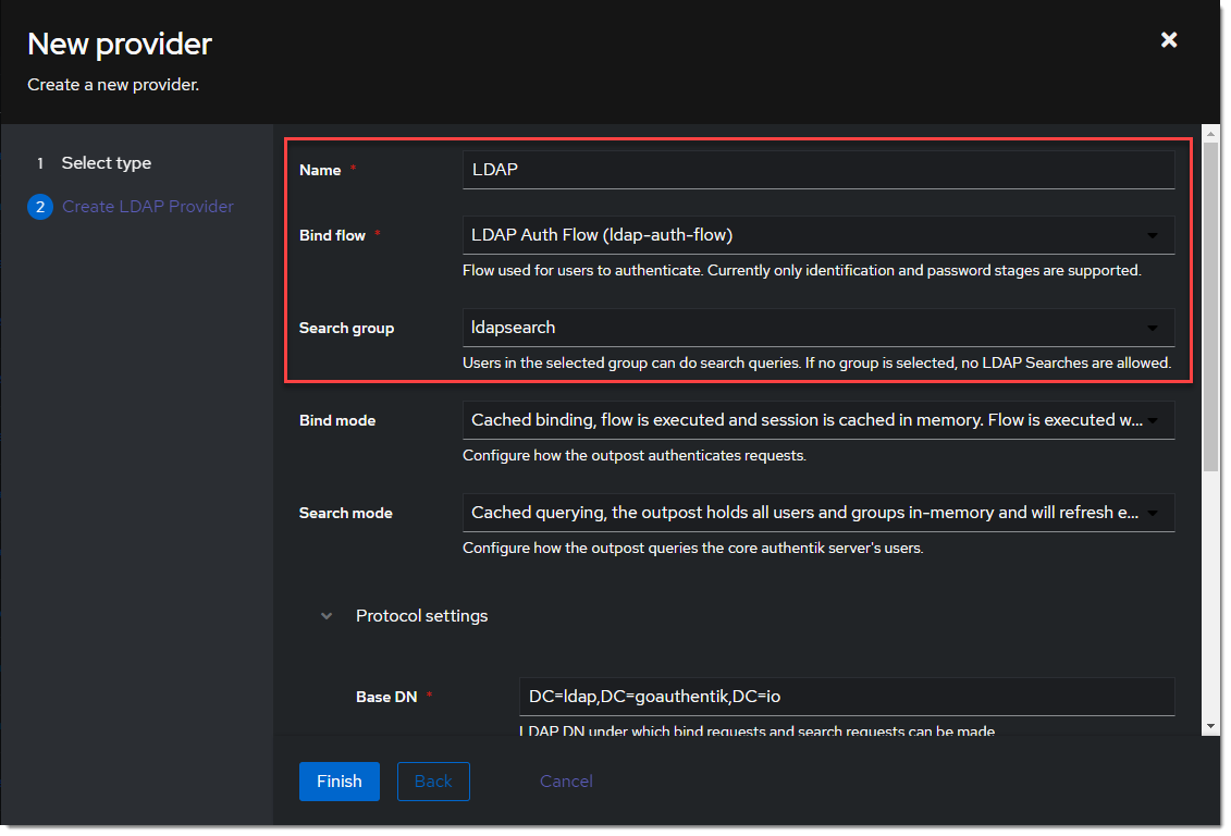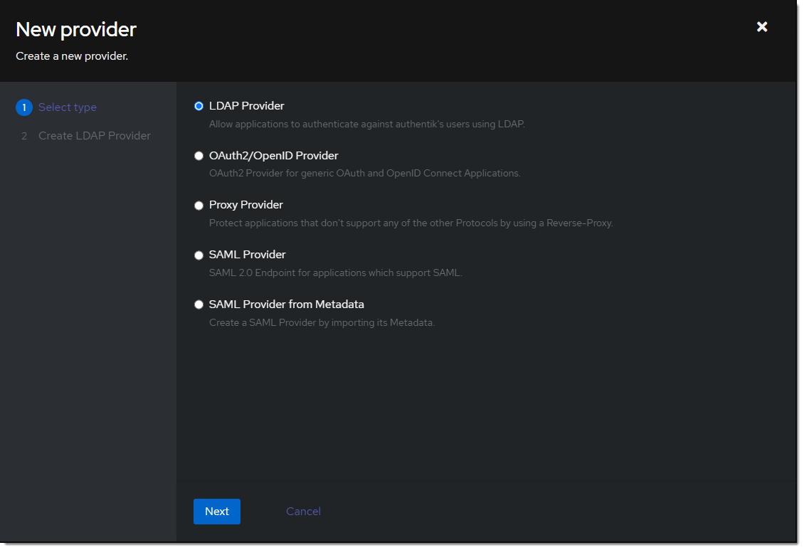 LDAP. Choose the provider created in the previous step.