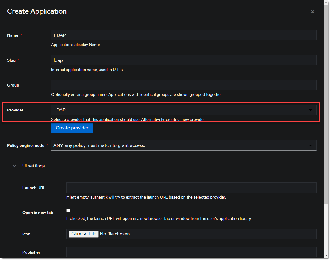 - Create the LDAP Provider under Applications -> Providers -> Create.