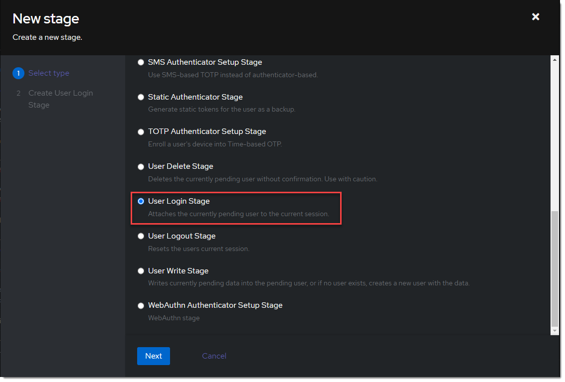- Create a new user login stage. Flows & Stage -> Stages -> Create